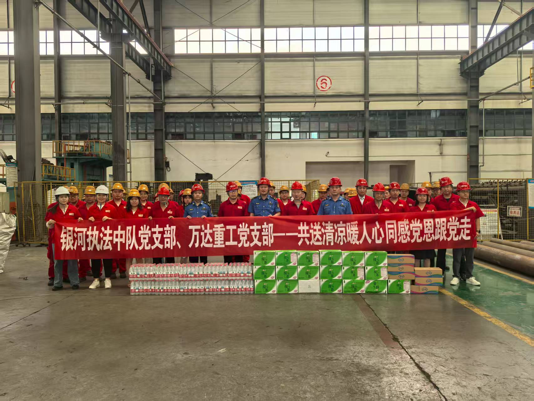 萬達重工黨支部活動情況:一、7月9日中午,銀河執(zhí)法中隊黨支部與萬達重工黨支部攜手走進萬達重工生產(chǎn)車間,開展“共送清涼暖人心,同感黨恩跟黨走”活動,為一線員工贈送冰糕、綠茶和礦泉水等物品。此活動在頂端新聞“鄭州市航空港區(qū)銀河辦事處官方賬號”上發(fā)布。