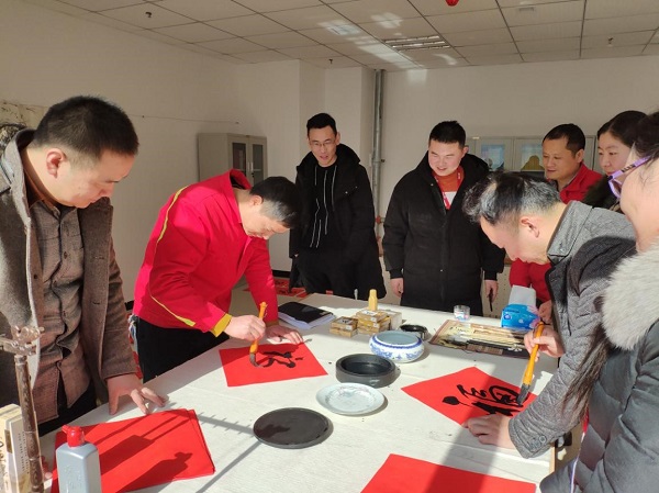 當(dāng)天中午,在工會(huì)主席于江山的帶領(lǐng)下,股份公司書(shū)法愛(ài)好者王英豪、劉松橋、靳奎、梁?jiǎn)⒊?、張珊珊等人在?shū)畫(huà)閱覽室擺開(kāi)書(shū)案,攤開(kāi)紅紙,揮毫潑墨,寫(xiě)福字、寫(xiě)對(duì)聯(lián),紅彤彤的福字和對(duì)聯(lián)將現(xiàn)場(chǎng)點(diǎn)綴出濃濃的年味兒。