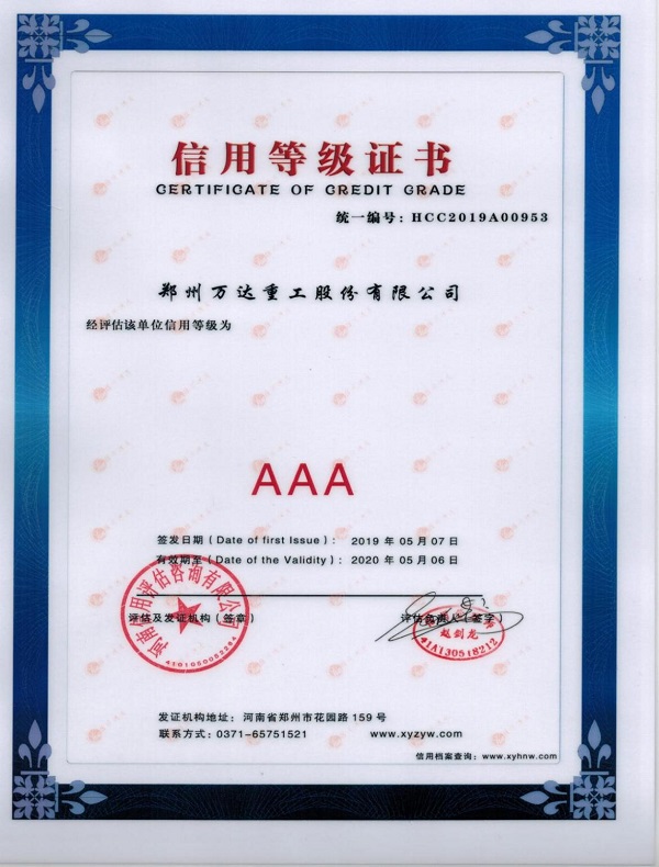 2019年5月7日,河南信用評估咨詢有限公司簽發(fā)AAA主體信用等級證書授予鄭州萬達(dá)重工股份有限公司。在2019年的AAA主體信用評級中,鄭州萬達(dá)重工股份有限公司順利通過復(fù)審,榮獲AAA信用等級證書,保持了連續(xù)多年的AAA信用等級。