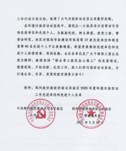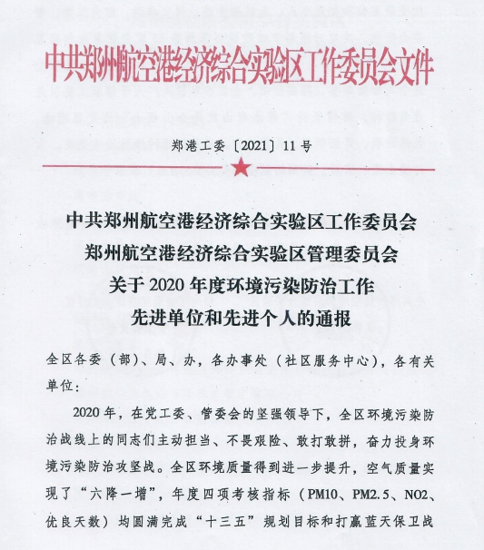 鄭州萬達(dá)重工股份有限公司榮獲鄭州航空港經(jīng)濟(jì)綜合實(shí)驗(yàn)區(qū)2020年度環(huán)境污染防治工作先進(jìn)單位