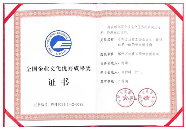 鄭州萬(wàn)達(dá)重工股份有限公司以系統(tǒng)完善的企業(yè)文化體系及卓有成效的企業(yè)文化實(shí)踐,榮獲“2020-2021年度全國(guó)企業(yè)文化優(yōu)秀成果二等獎(jiǎng)”!