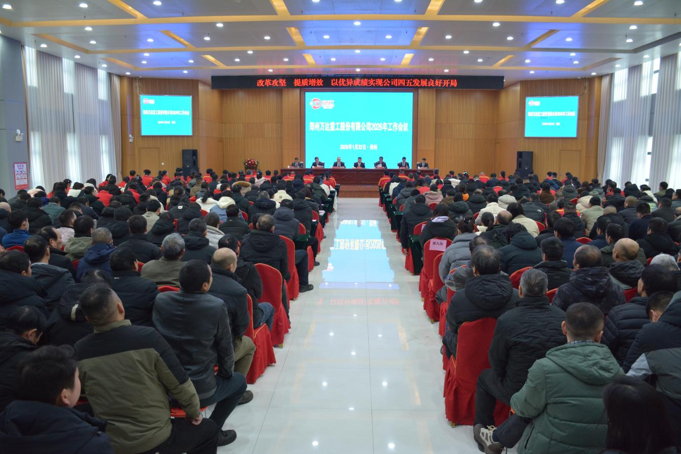 2026年1月22日,鄭州萬(wàn)達(dá)重工股份有限公司2026年工作會(huì)議在股份公司多功能廳隆重召開。股份公司黨委書記、董事長(zhǎng)何清,董事、總經(jīng)理張付峰,黨委副書記、工會(huì)主席于江山,董事、常務(wù)副總經(jīng)理王立軍,監(jiān)事、總工程師袁希海,董事、財(cái)務(wù)總監(jiān)劉保國(guó),生產(chǎn)副總經(jīng)理劉松橋等領(lǐng)導(dǎo)出席會(huì)議并在主席臺(tái)就座,股份公司及子公司全體員工參會(huì)。