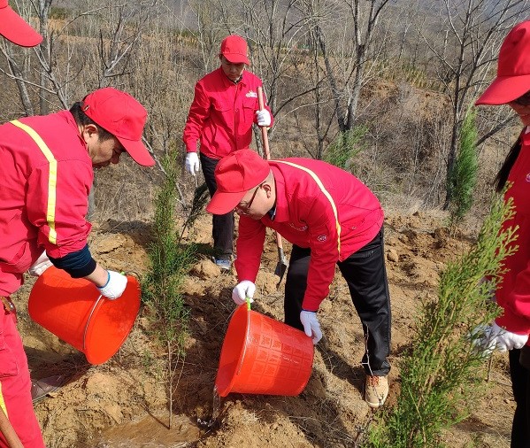 在植樹現(xiàn)場(chǎng),萬(wàn)達(dá)重工黨總支旗及各支部黨小組旗迎風(fēng)飄揚(yáng),大家分工合作,配合默契,揮鍬鏟土、扶直苗木、培實(shí)新土、提桶澆水,栽下一株株樹苗,每道工序都做得仔細(xì)認(rèn)真,現(xiàn)場(chǎng)呈現(xiàn)一片忙碌景象,汗水揮灑處,一株株樹苗迎風(fēng)挺立,展現(xiàn)出勃勃生機(jī)。經(jīng)過(guò)熱烈有序的植樹勞動(dòng),共栽植側(cè)柏、油松苗木150余棵,順利完成了義務(wù)植樹任務(wù)。