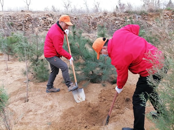 栽下棵棵樹苗,留下一片新綠。植樹現(xiàn)場黨旗、司旗、黨小組旗幟在風中迎風飄揚,植樹活動中,一派緊張有序、熱火朝天的勞動景象,大家個個態(tài)度積極、熱情高漲、干勁十足,揮鍬挖坑、運送樹苗、扶植苗木、培實新土、提桶澆灌,大家比干勁、比質(zhì)量,各個環(huán)節(jié)銜接有序,樣樣做得認真到位,大家樂在其中,配合默契,真正是勁往一處使、汗往一處流,一株株樹苗迎風挺立,展現(xiàn)出勃勃生機。經(jīng)過熱烈有序的植樹勞動,共栽植側柏、油松苗木200余棵,順利完成了義務植樹任務。