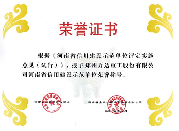 熱烈祝賀鄭州萬達重工股份有限公司通過了“河南省信用建設(shè)促進會”和“河南省企業(yè)信用評審委員會辦公室”共同組織的“河南省信用建設(shè)示范單位”復審認證,被認定為“河南省信用建設(shè)示范單位”榮譽稱號!