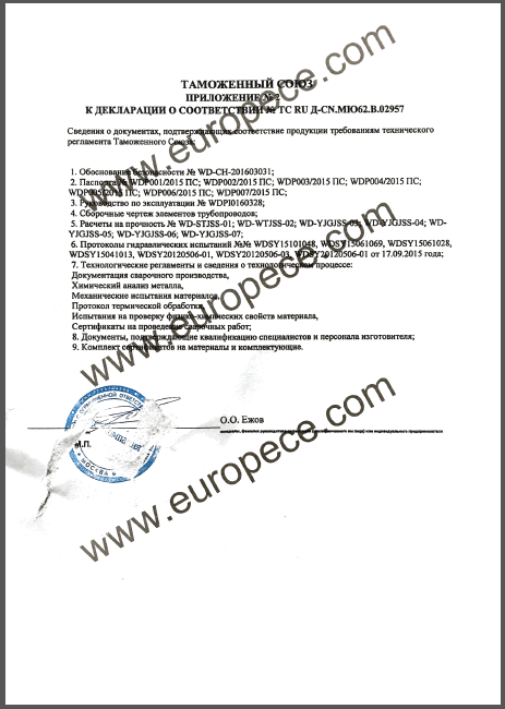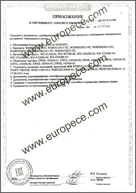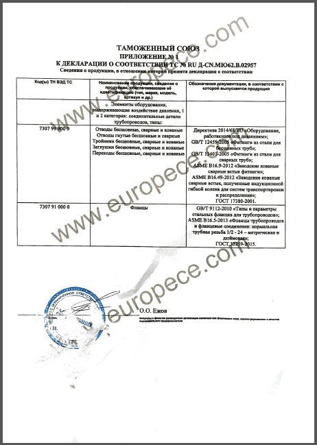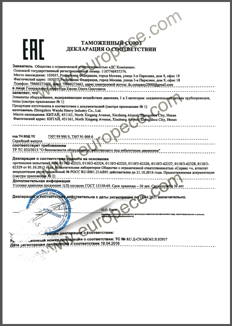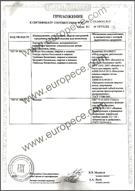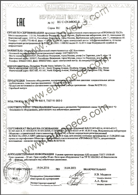 CU-TR認(rèn)證產(chǎn)品覆蓋萬達(dá)重工生產(chǎn)的彎管、法蘭等各類型產(chǎn)品,認(rèn)證證書的取得是俄白哈對萬達(dá)重工產(chǎn)品資料、安全標(biāo)識、產(chǎn)品性能的肯定,同時驗證了萬達(dá)重工的產(chǎn)品質(zhì)量又邁上了一個更高的臺階。近年來,我公司積極開拓海外市場,把擴(kuò)大國際市場作為重要的發(fā)展戰(zhàn)略,此次CU-TR認(rèn)證證書的取得,為我司進(jìn)一步開拓歐洲市場提供了強(qiáng)有力的保證。