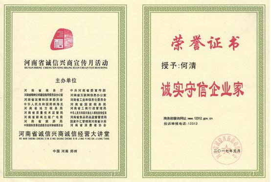熱烈祝賀鄭州萬(wàn)達(dá)重工股份有限公司及公司董事長(zhǎng)、書記何清先生在“河南省誠(chéng)信興商宣傳月”活動(dòng)中被河南省商務(wù)廳、中共河南省委宣傳部、河南省精神文明建設(shè)指導(dǎo)委員會(huì)辦公室、河南省互聯(lián)網(wǎng)信息辦公室、河南省發(fā)展和改革委員會(huì)、河南省工業(yè)和信息化委員會(huì)、中華人民共和國(guó)鄭州海關(guān)、河南省國(guó)家稅務(wù)局、河南省地方稅務(wù)局、河南省工商行政管理局、河南省質(zhì)量技術(shù)監(jiān)督局、中華人民共和國(guó)河南出入境檢驗(yàn)檢疫局、河南省新聞出版廣電局、河南省食品藥品監(jiān)督管理局、河南省旅游局、河國(guó)家外匯管理局河南省分局、中國(guó)國(guó)際貿(mào)易促進(jìn)委員會(huì)河南省委員會(huì)、河南省消費(fèi)者協(xié)會(huì)等18個(gè)部委聯(lián)合認(rèn)定為“誠(chéng)信興商雙優(yōu)示范單位”和“誠(chéng)實(shí)守信企業(yè)家”。