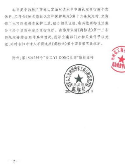 根據(jù)國家工商行政管理總局商標(biāo)局下發(fā)的商標(biāo)馳字【2017】108號《工商總局商標(biāo)局關(guān)于認(rèn)定“益工 YI GONG及圖”商標(biāo)為馳名商標(biāo)的批復(fù)》文件,公司使用在商標(biāo)注冊用商品和服務(wù)國際分類第6類金屬管道配件商品上的“第1594235號益工YI GONG及圖”商品被認(rèn)定為中國馳名商標(biāo)”,這不僅是公司商標(biāo)保護(hù)的重大成果,也實(shí)現(xiàn)了鄭州航空港經(jīng)濟(jì)綜合實(shí)驗(yàn)區(qū)馳名商標(biāo)零的突破。