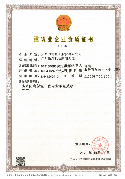 熱烈祝賀鄭州萬達(dá)重工股份有限公司順利通過了由鄭州市城鄉(xiāng)建設(shè)委員會航空港實驗區(qū)批復(fù)的《防水防腐保溫工程專業(yè)承包貳級資質(zhì)》,證書編號:D441269713,有效期:2020年09月09日至2025年09月09日。