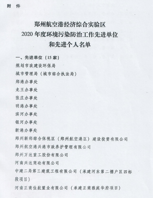 鄭州萬達(dá)重工股份有限公司榮獲鄭州航空港經(jīng)濟(jì)綜合實(shí)驗(yàn)區(qū)2020年度環(huán)境污染防治工作先進(jìn)單位