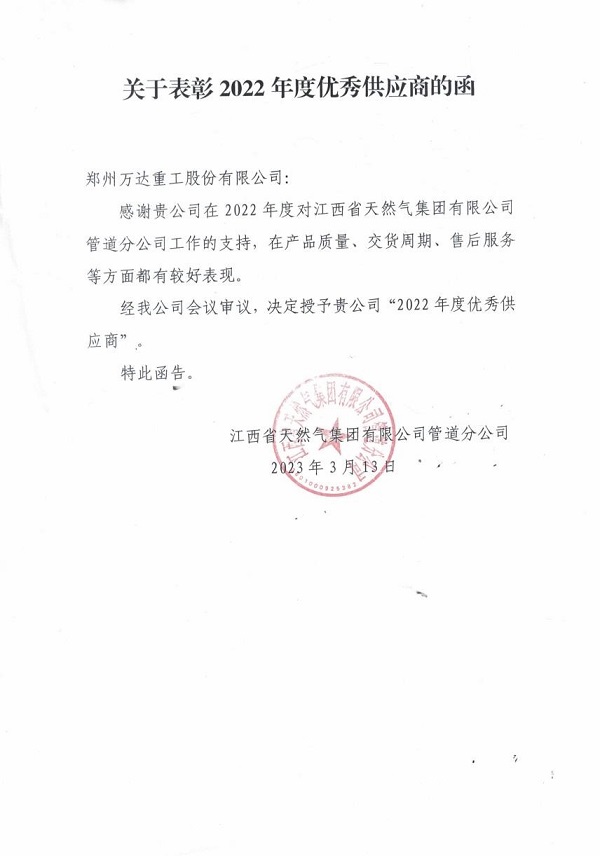 近日,鄭州萬達重工股份有限公司收到了江西省天然氣集團有限公司管道分公司頒發(fā)的2022年度“優(yōu)秀供應(yīng)商”榮譽獎牌,獲得該公司2022年度優(yōu)秀供應(yīng)商榮譽稱號。業(yè)主方對公司所承接彎管項目的產(chǎn)品質(zhì)量、交貨周期、售后服務(wù)等方面給予高度贊揚。