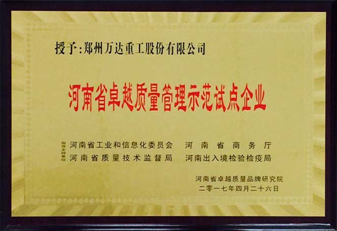 2017/05/03 474 熱烈祝賀鄭州萬達重工股份有限公司榮獲由河南省工業(yè)和信息化委員會、河南省商務(wù)廳、河南省質(zhì)量技術(shù)監(jiān)督局及河南出入境檢驗檢疫局等單位共同指導(dǎo),河南省卓越質(zhì)量品牌研究院組織評選認定的河南省卓越質(zhì)量管理示范試點企業(yè)榮譽稱號。