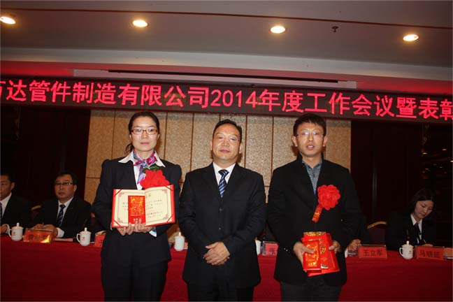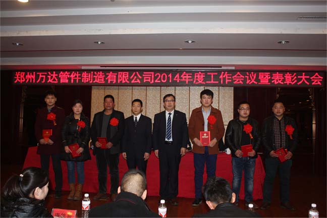 鄭州萬(wàn)達(dá)管件制造有限公司2014年年會(huì)于2015年1月20日隆重召開。會(huì)議首先表彰了公司2014年度先進(jìn)工作者、先進(jìn)部門及班組、優(yōu)秀干部、年度進(jìn)步之星、銷售冠軍、優(yōu)秀黨員等十余個(gè)獎(jiǎng)項(xiàng),并對(duì)獲獎(jiǎng)?wù)哳C發(fā)了獎(jiǎng)金和證書。公司董事長(zhǎng)、黨委書記何清同志在會(huì)議上做了題為《適應(yīng)新常態(tài) 開創(chuàng)新局面 實(shí)現(xiàn)公司持續(xù)健康穩(wěn)定發(fā)展 》的報(bào)告,總結(jié)了2014年公司的發(fā)展歷程,取得的成績(jī)和不足,展望和部署2015年公司發(fā)展的目標(biāo)和重點(diǎn)工作,為公司全力建設(shè)五位一體的萬(wàn)達(dá)事業(yè)指明了努力方向。公司全體人員中午舉行了盛大的團(tuán)拜招待會(huì),歡聚一堂,其樂(lè)融融。